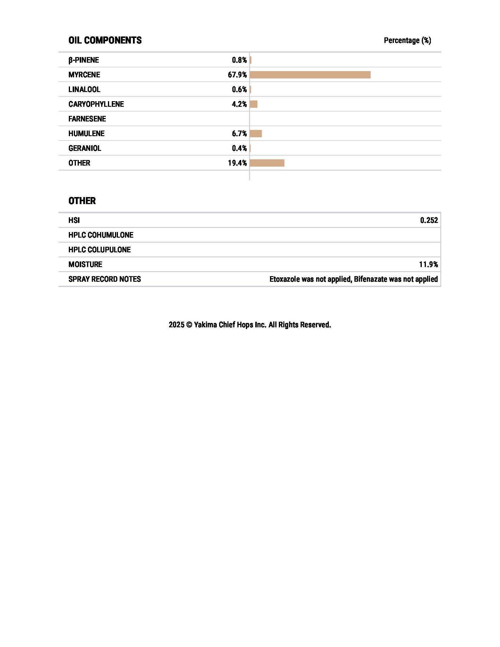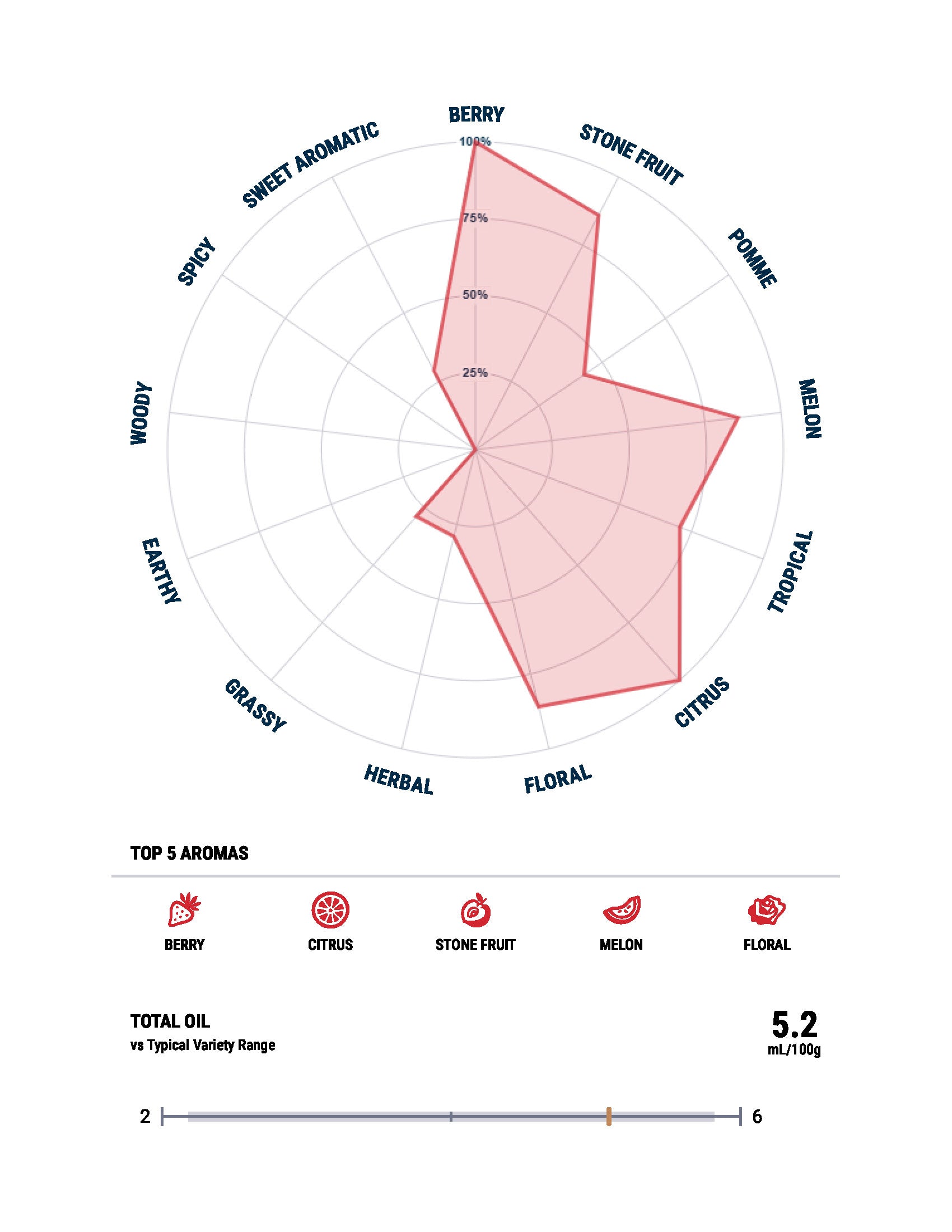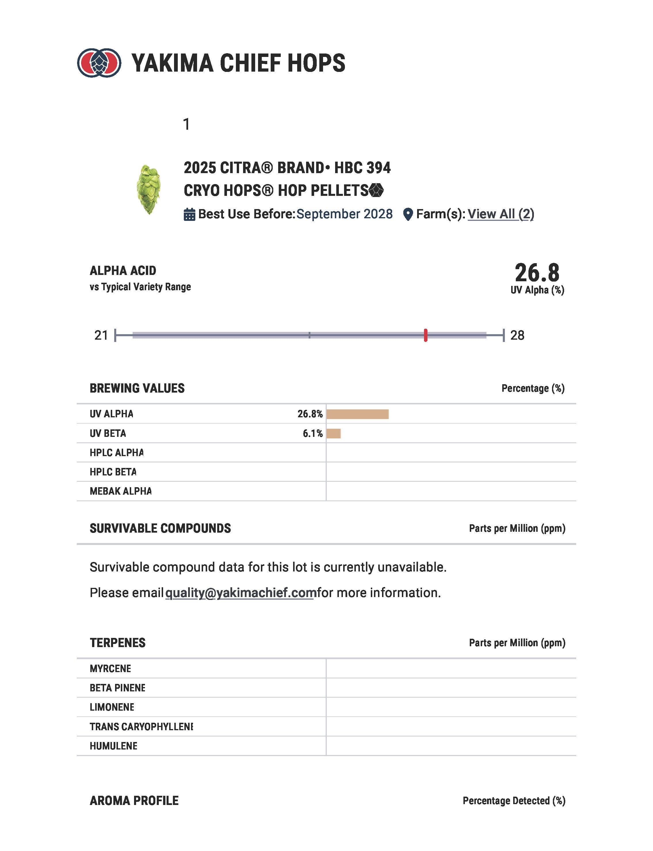 USA HopsCitra®, as the name implies, has a strong citrusy profile. This is largely credited to its very high myrcene content. It has an extraordinary flavor profile of grapefruit, lime and tropical fruits.