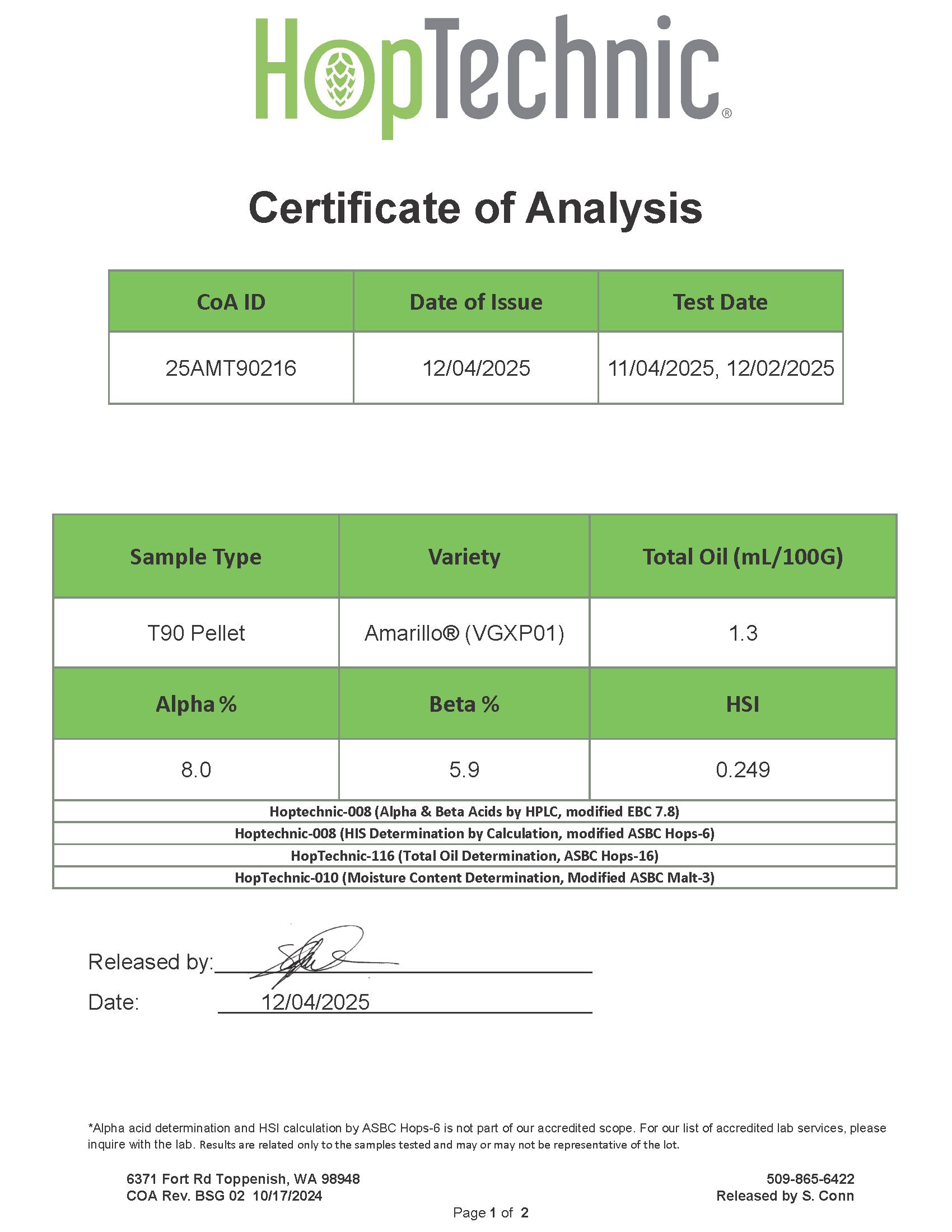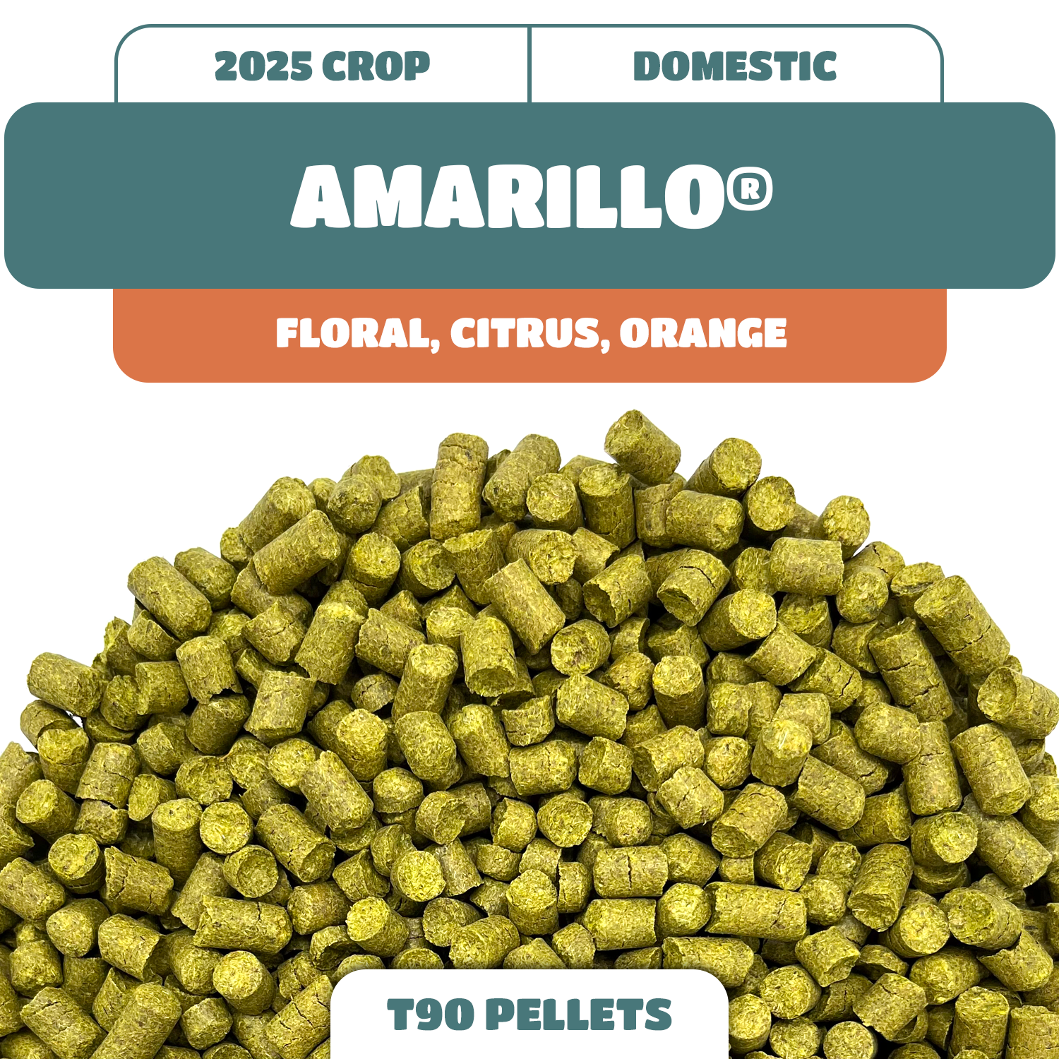 Amarillo® hops are used worldwide where its ultra-high myrcene content creates a delicious orange citrus flavor. A varietal of Virgil Gamache Farms, Inc. Amarillo® is highly acidic, making it a perfect choice for ESB’s and Pale Ales.