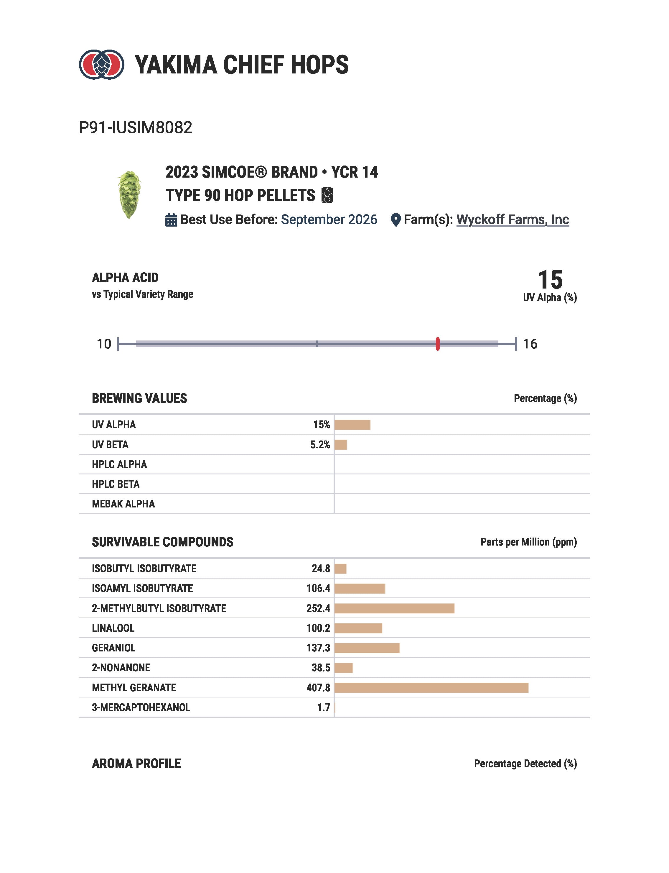 USA HopsSimcoe hops have a high alpha percentage and low Cohumulone, making a nice bittering hop. Also noted for its favorable. It has a pleasantly fruity, yet earthy herbal and piney aroma.